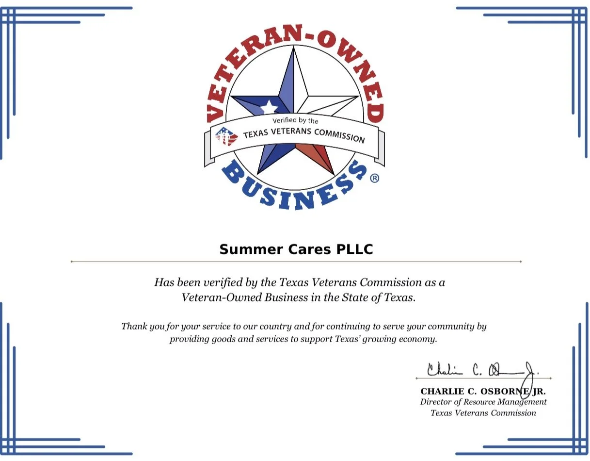 As a veteran-owned business, Summer Cares is built on integrity, dedication, and service. My mission is to create comfort, trust, and consistency in every encounter—helping families feel confident that their care is always in compassionate, capable hands.